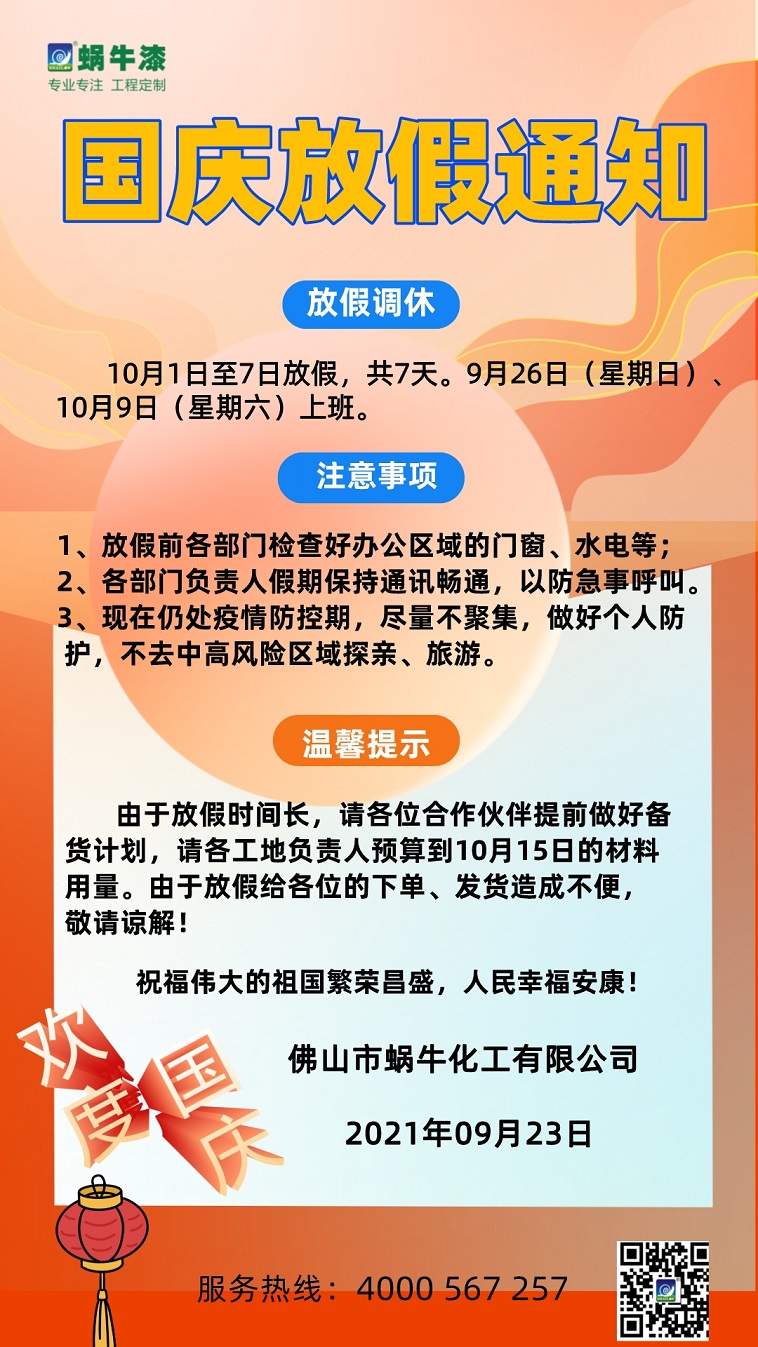 由于国庆放假时间较长,请各位合作伙伴提前做好备货计划,特别是正在施工的工地,请工地负责人预算好到10月15日的材料用量。由于放假给您的下单、发货造成不便,敬请谅解,感谢配合。
